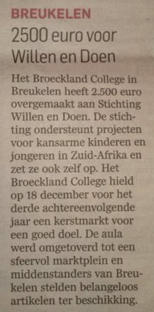 These are topics that were discussed with the students. In three days Wil Groot presented 20 classes of VMBO students, all of whom listened attentively and kept asking questions. After the lesson many students immediately took action, collected and sold hearts for Willen and Doen. At home she told about what they had learned and many parents visited the Christmas market that was organized at the school on December 18th. Proceeds 2500 euros.