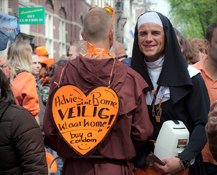 Queen's Day 2009, Amsterdam, dressed as a clergyman selling hearts and crowns.